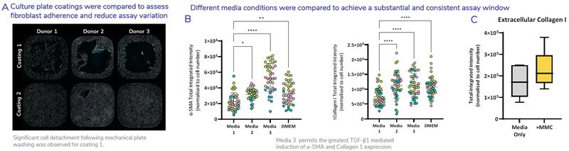 Figure 2. FMT assay conditions have been optimized to ensure reproducibility and achieve the greatest assay window. A) 384-well plates were coated with two different coatings then Normal HLF were seeded into wells at an equal density. Cells were fixed and stained using Hoechst 33342 to detect cell nuclei representative images shown of whole well x4 magnification. B) Four assay medias were compared to test which provides the greatest assay window. HLF were stimulated with TGF-β1 in four different assay medias. Shown is total integrated intensity normalized to cell number for a-SMA (left) and collagen 1 (right) of HLF (N=3 donors each colour point represents a donor) stimulated with 1ng/mL TGF-β1. Statistical analysis performed one-way ANOVA with Dunnett’s multiple comparisons test compared to Media 1. C) Inclusion of a macromolecular crowding agent (MMC) in the culture media promotes deposition of extracellular matrix and shows an increase in the baseline expression of extracellular collagen 1. Image Credit: Newcells Biotech