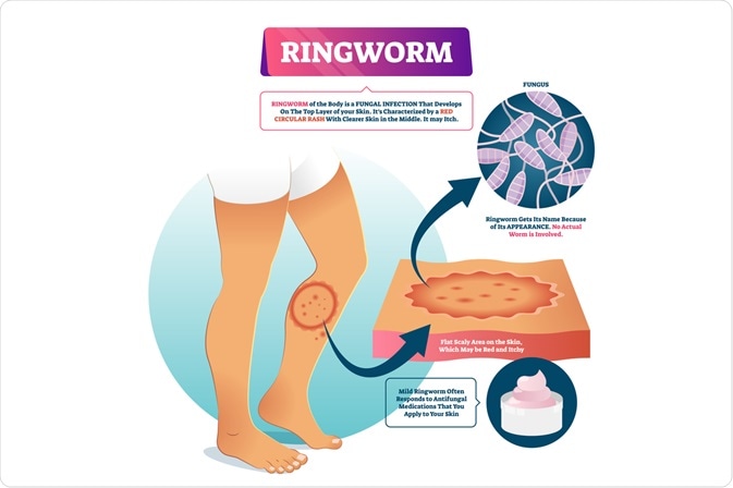 The fungi named dermatophytes are responsible for the skin infection called ringworm. These fungi can be transferred to babies from dogs, cats, guinea pigs, and other common family pets. If a person has been infected by ringworm infection, their clothes, bed linen, towels, and other contaminated items can help in transmitting the infection.