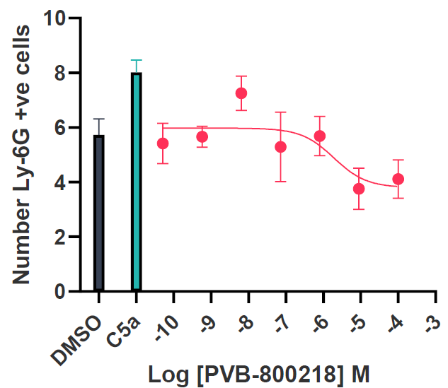 The C5aR1 allosteric site is not present in the mouse isoform. Thus, a humanized mouse model was developed. To validate this model, initial data identified the ability of the compounds to inhibit C5a-induced neutrophil activation (reduced CD11b expression) as well as reducing the expression of Ly6G, a marker of chemotactic cells, confirming the chemotaxis data with hiPSC microglia.