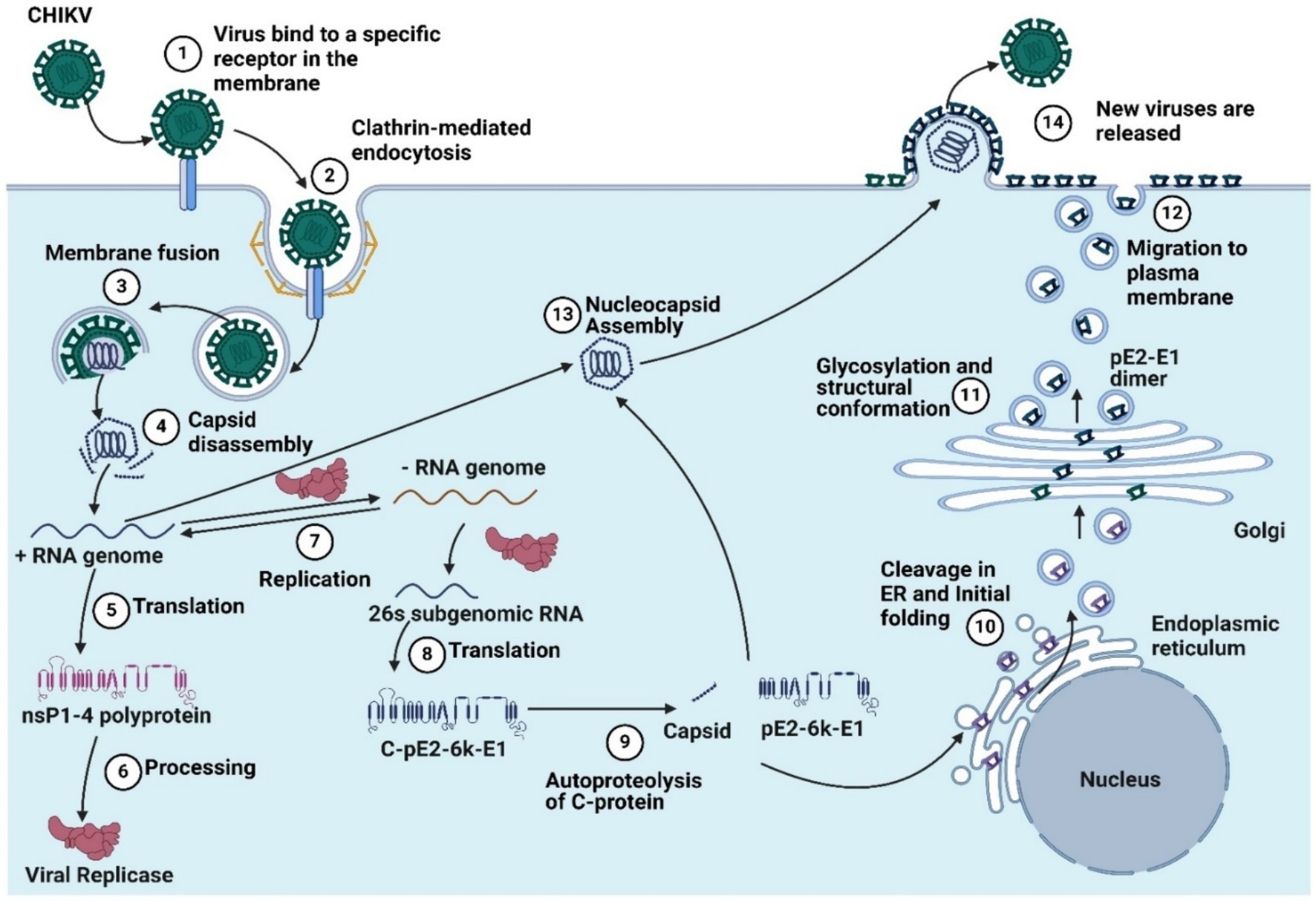 The chikungunya virus replication cycle includes (1) virus binding to a specific receptor in the membrane, (2) clathrin-mediated endocytosis, (3) membrane fusion, (4) capsid disassembly, (5) translation, (6) processing, (7) replication, (8) 26’s subgenomic RNA translation, (9) autoproteolysis, (10) cleavage in the endoplastic reticulum and initial folding, and (11). Glycosylation and structural conformation, (12) migration to the plasma membrane, (13) nucleocapsid assembly, and (14) the release of new viruses (Created by using Biorender.com).[9]