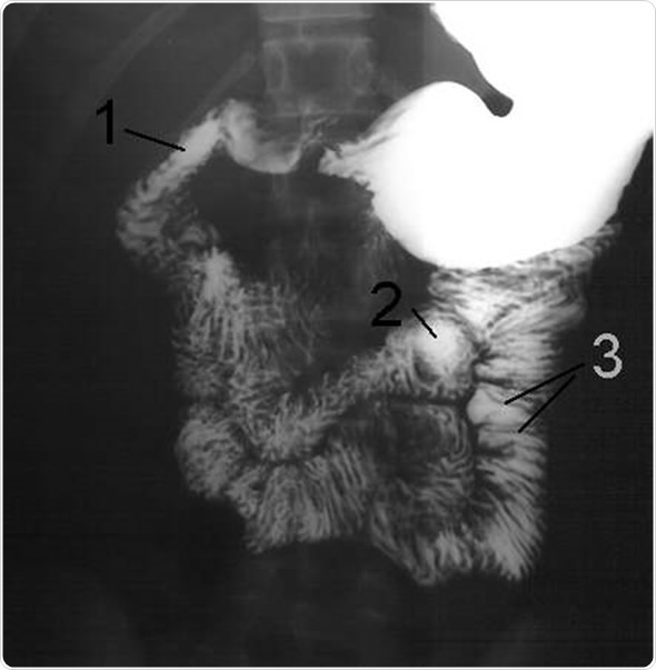 Some initial images are taken to check that the barium has passed through the esophagus, and into the stomach and small bowel. The radiographer then takes a series of X-ray images over time as the barium contrast moves through the digestive system. This may mean images are taken over anywhere between 1 and 4 hours. Once the barium contrast has passed through to the large bowel or the colon, more pictures are taken. The whole test may take around 5 hours.