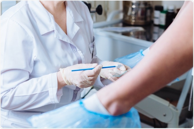 The pap smear is done by microscopic examination of the cells obtained by gentle scraping of the cervix with a special curved wooden or plastic scraping tool, or a tiny brush. In order to visualize the cervix, the patient needs to lie on her back with the legs spread apart a little so that a speculum can be used to stretch the vagina very gently.