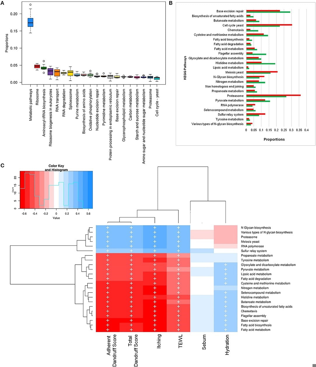 Functional analysis of fungal microbiome. (A) Twenty most abundant fungal metabolic pathways in the healthy scalp. (B) Differentially abundant (p ≤ 0.05) fungal pathways between healthy (green bars) and dandruff scalp (red bars). (C) Spearman's correlation between fungal metabolic pathways and host physiological parameters. Fungal taxa showing significant correlations (+, FDR adjusted p ≤ 0.05) with any of the parameters are plotted as a heatmap.1
