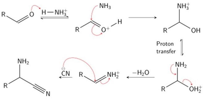 - Stage 1: Addition of ammonia and hydrogen cyanide to an aldehyde to form an α-amino nitrile.