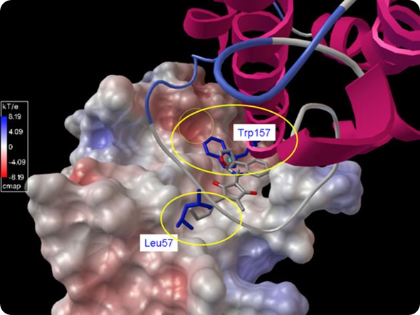 An electrostatic representation (red: negative; blue: positive; white: hydrophobic) created at the Ohio Supercomputer Center by Ohio State’s Chenglong Li, Ph.D., shows IL-6 in ribbon representation. The two larger yellow ellipses indicate the two binding “hot spots” between IL-6 and GP130.