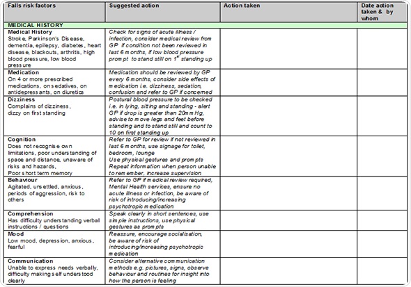 Also, the manual contains information about interventions to try and overcome these risk factors. It will tell you what to do if someone has a blood pressure problem, an eyesight problem or a problem drinking their fluids (inadequate fluid intake can also increase the risk of falling over).
