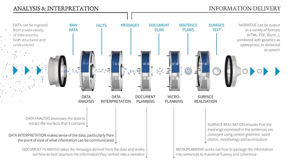 NLG systems use data analysis and artificial intelligence techniques to analyze complex data sets, and computational linguistic techniques to communicate the results of the analysis in a high-quality narrative text.