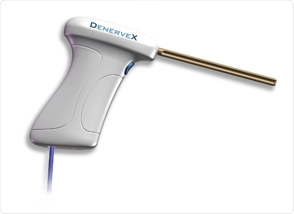 The DenerveX System consists of the DenerveX device, a single use medical device and the DenerveX Pro-40 Power Generator, both designed to be less invasive with faster recovery time than current surgical treatment options. It consists of two procedures combined into one device and is expected to provide for a longer lasting treatment solution while offering potential savings to the health care system. DenerveX is not yet commercially available.