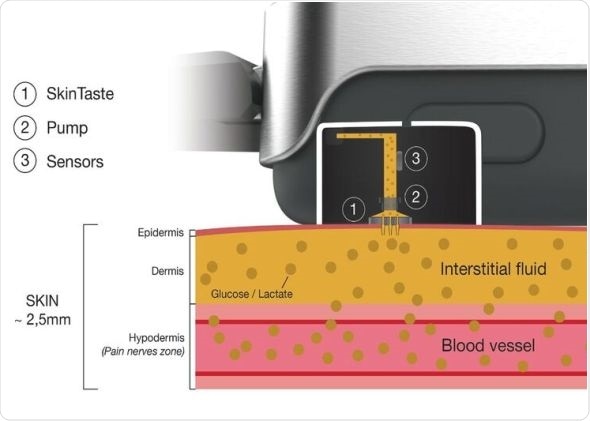 The SkinTaste technology contained within the K’apsul works by inserting tiny micro-needles just <0.5mm long into the skin to probe interstitial fluid, a solution that surrounds the tissue cells of all multicellular animals. On average 16 percent of a person’s body weight (or 10 liters for the average person) is made up of this liquid, which provides cells with nutrients and a means of waste removal. This fluid absorbs chemicals and biomarkers such as glucose directly from the blood, which can be detected by the SkinTaste biosensor.