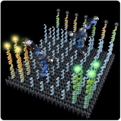 The nanobot randomly moved around a two-dimensional testing ground as its "feet" sections bound to complimentary DNA stands. Similarly, the cargo molecules bound to a complimentary DNA sequence on the robot's "hand". Another sequence on the "hand" recognised the target destination, causing it to release its cargo in a pre-designated area. In the reported experiment, the DNA robot picked up a molecule labelled with a fluorescent yellow dye and a second type of molecule tagged with a fluorescent pink dye.