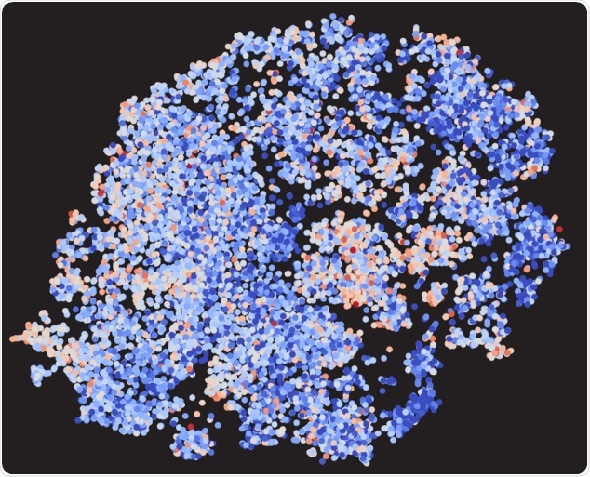Hot and cold regions of biology. Genes (dots) are mapped according to generic chemical and biological characteristics. Blue indicates cold regions, where genes are studied less frequently than anticipated under the assumption that every gene would be studied to the same extent. Credit: Thomas Stoeger