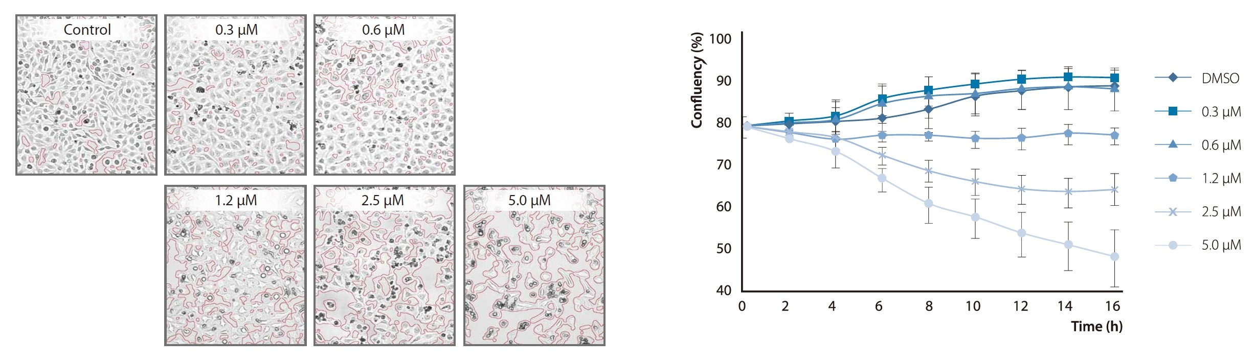 Confluent HeLa cells were treated with varying doses of Camptothecin (CPT) at 2 hour intervals for 6 hours and subsequently imaged to determine how CPT concentration affects cell viability. CELENA®X Cell Analyzer was used to measure the confluency of cells in a multi-well plate in a rapid, reproducible, and quantifiable manner