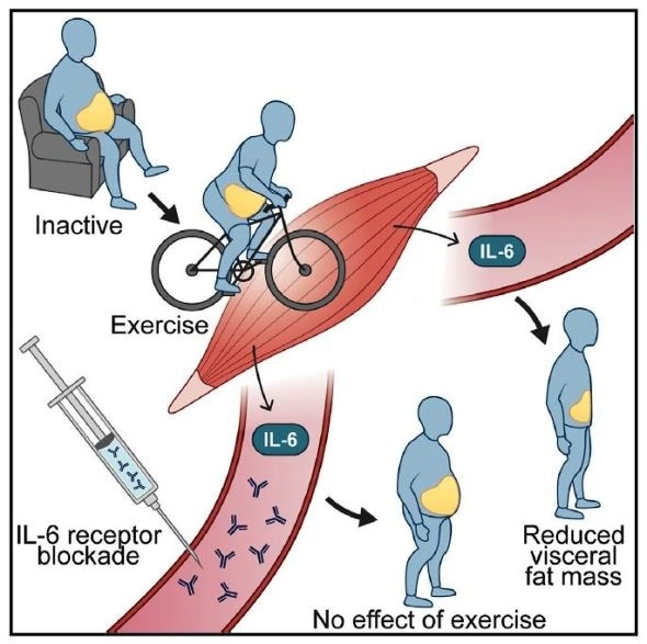 This graphical abstract shows that in abdominally obese people, exercise-mediated loss of visceral adipose tissue mass requires IL-6 receptor signaling. Credit: Wedell-Neergaard, Lehrskov, and Christensen, et al. - Cell Metabolism