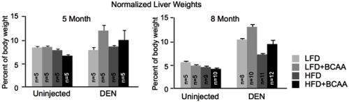 Figure 2: The two charts show the liver masses of mice at five month (left) and eight month (right) time points (normalized to the body weights of the mice). At both time points, mice which were introduced to diethylnitrosaine (DEN) - a compound which generates tumors from within an organism, and fed diets with high levels of BCAAs, had a greater tumor burden, as reflected by increased liver masses. This effect was consistent in diets containing either low or high levels of fat (LFD and HFD, respectively). Notably, the high BCAA diets did not substantially impact the healthy livers of uninjected mice.