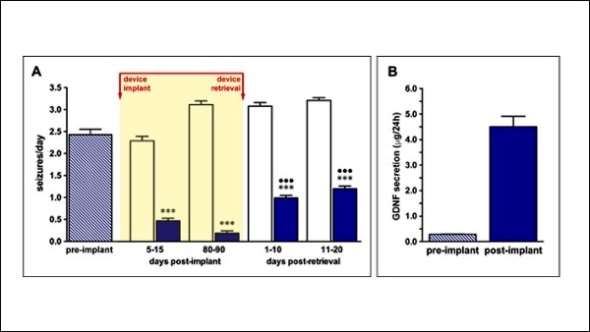 A protein-secreting device implanted into the hippocampus of epileptic rats reduces seizures by 93 percent in three months, finds preclinical research published in JNeurosci. These results support ongoing development of this technology and its potential translation into a new treatment for epilepsy.