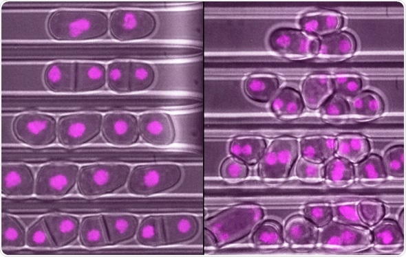 S. japonicus yeast cells, with nuclei shown in pink, which have been edited so that they cannot scale. The cells are shown dividing over time, starting at the top and after approximately four hours at the bottom. The cells on the left are in a narrow channel to restrict their width and are able to divide correctly, while those on the right in a wider channel cannot. Credit: Snezhka Oliferenko