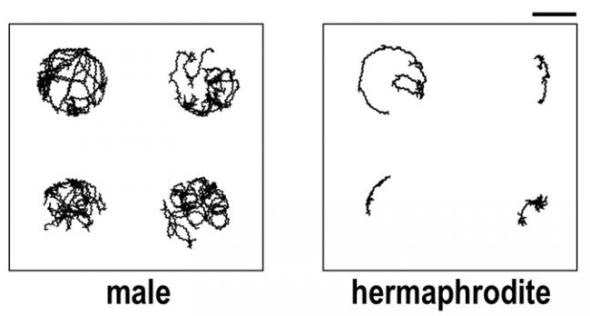 Male and hermaphrodite roundworms (Caenorhabditis elegans) have distinct strategies for finding food and mates. Satoshi Suo and colleagues found the neurotransmitter dopamine has opposite effects on these behaviors that supports each sex’s strategy. Dopamine increases locomotor activity in males, which need to move around to find a mate, while reducing the same activity in hermaphrodites, which can reproduce asexually and may conserve energy by staying in place. The researchers show that dopamine acts through different molecular pathways to give rise to these sex differences.