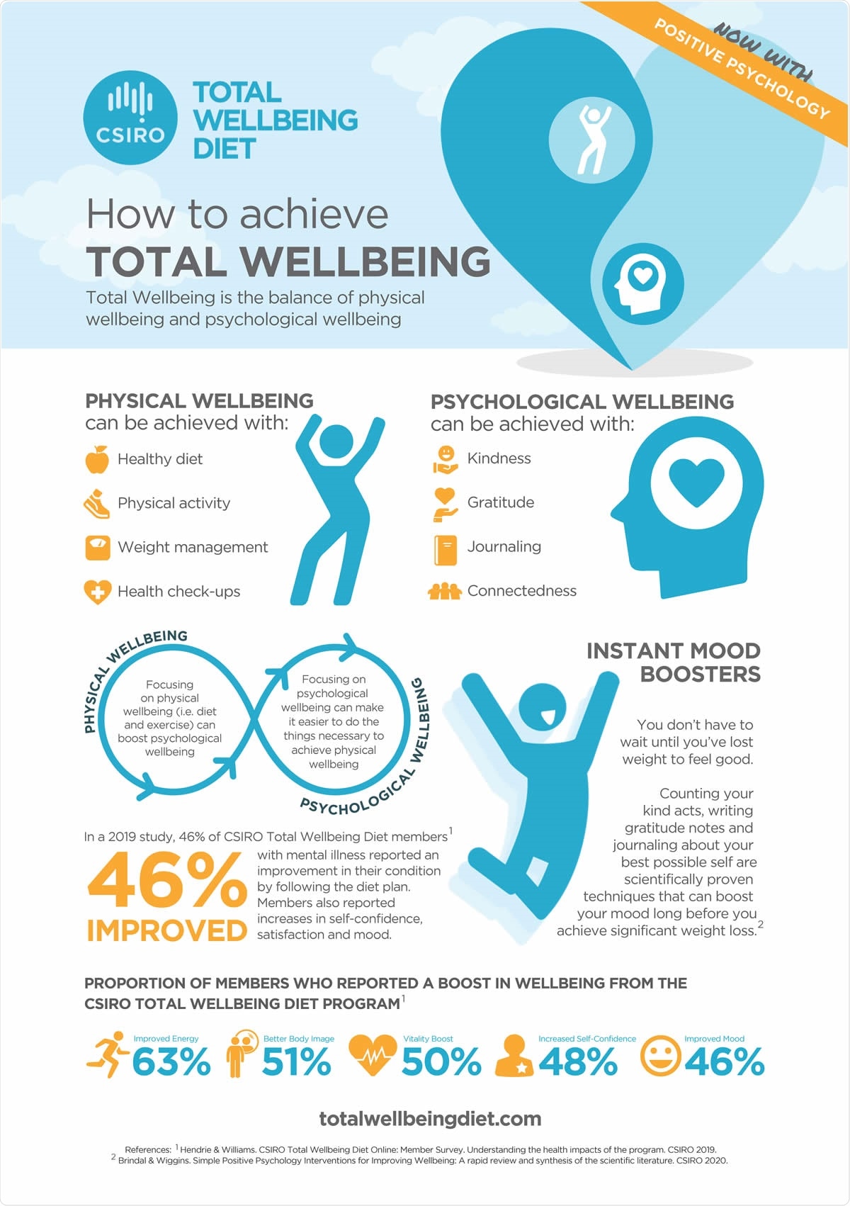 In order to combat this fall in general well being, the CSIRO Total Wellbeing Diet has launched an online wellness program with positive psychology tools that could help maintain emotional wellbeing and mood. Brindal said, "Lockdown has proven to be a time of both challenge and opportunity for Australians, with this 'global pause' allowing us to reset and rebuild as we look towards the future. The new wellbeing enhancement to the CSIRO Total Wellbeing Diet online lifestyle program will help Australians seeking reliable and trusted frameworks and support to help them improve their health and wellbeing during the current climate, and beyond."