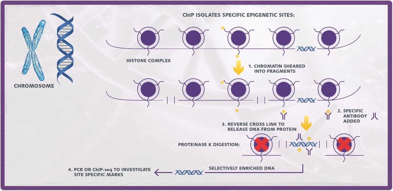 By using an antibody that is targeting a specific epigenetic regulation in the immunoprecipitation stage and qPCR or next generation sequencing allows investigators to review the epigenetic landscape on a single gene or throughout whole genome.