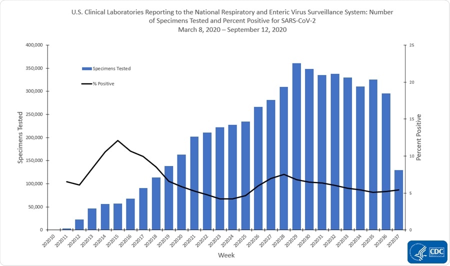 The United States has reported the highest number of coronavirus disease cases (COVID-19), with more than 6.88 million infections since the start of the pandemic. Now, eight months into the pandemic, caused by the severe acute respiratory syndrome coronavirus 2 (SARS-CoV-2), the U.S. Centers for Disease Control and Prevention (CDC) reports a decreasing percentage of respiratory specimens testing positive for the virus.