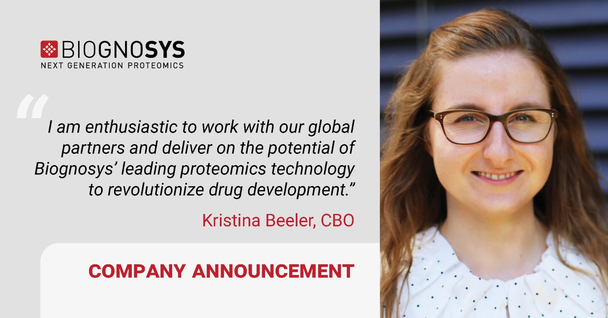As new CBO, Kristina Beeler will continue to further potentiate the value of proteomics by collaborating with global partnersBiognosys, a leader in next-generation proteomics solutions for drug discovery and development, announces today the appointment of Kristina Beeler as Chief Business Officer. In this role, Kristina will serve as a member of Biognosys’ executive management and will be responsible for leading the company’s global commercial and business development activities for its contract research business.