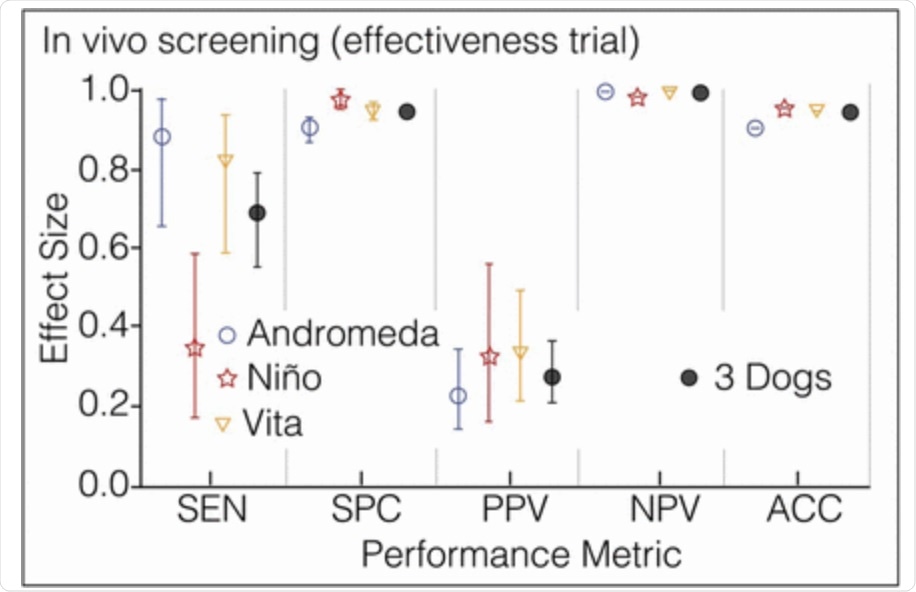 The efficiency by which the dogs could identify the scent was then directly matched against RT-PCR results in approximately 850 subjects. This group contained three different cohorts with varying disease prevalence.