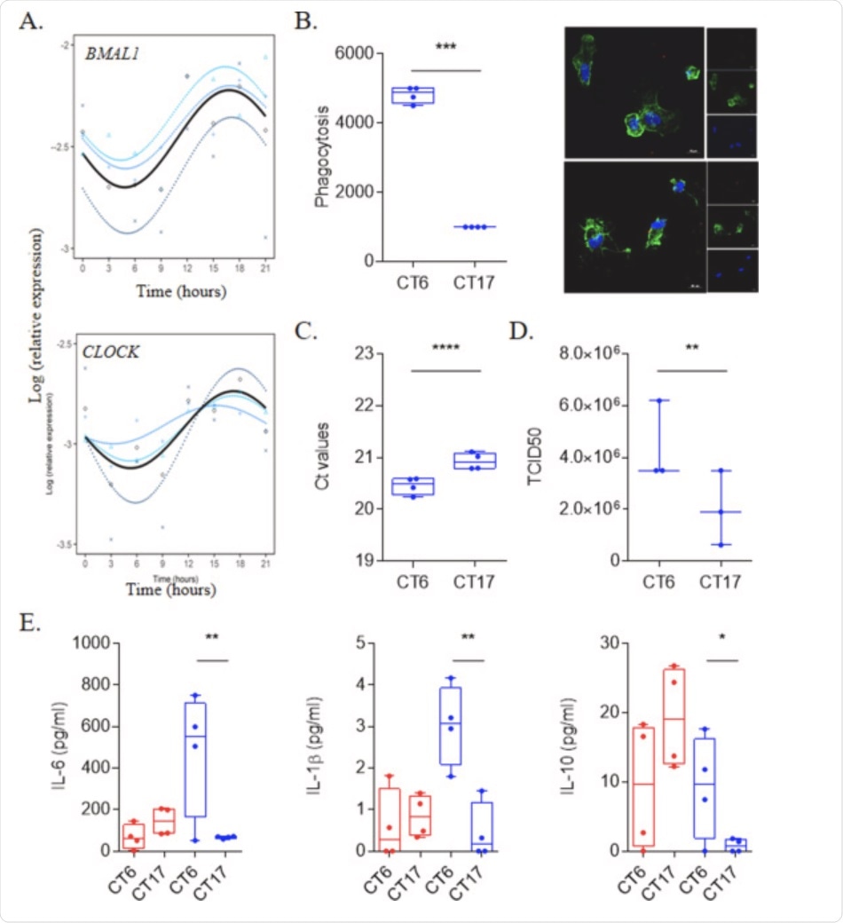 Fig. 1. SARS-CoV-2 infection is link to circadian rhythm. (A) Circadian rhythm of BMAL1 and CLOCK genes in monocytes using Cosinor model from 4 different donors. (B) Virus load (n = 4) and titers (n = 3) at CT6 and CT17 time from experiments that were repeated 3 times using at least 3 different donors. (C) Representative pictures and phagocytosis activity of monocytes (F-actin in green and nucleus in blue) infected by SARS-CoV-2 virus (red). Results are expressed as the mean ± SEM of 4 donors with 3 independent experiments. (D) Level of IL-6, IL-1β and IL-10 of unstimulated (red) and infected cells at CT6 and CT17. Results are expressed as the mean of 4 donors from 3 independent experiments.