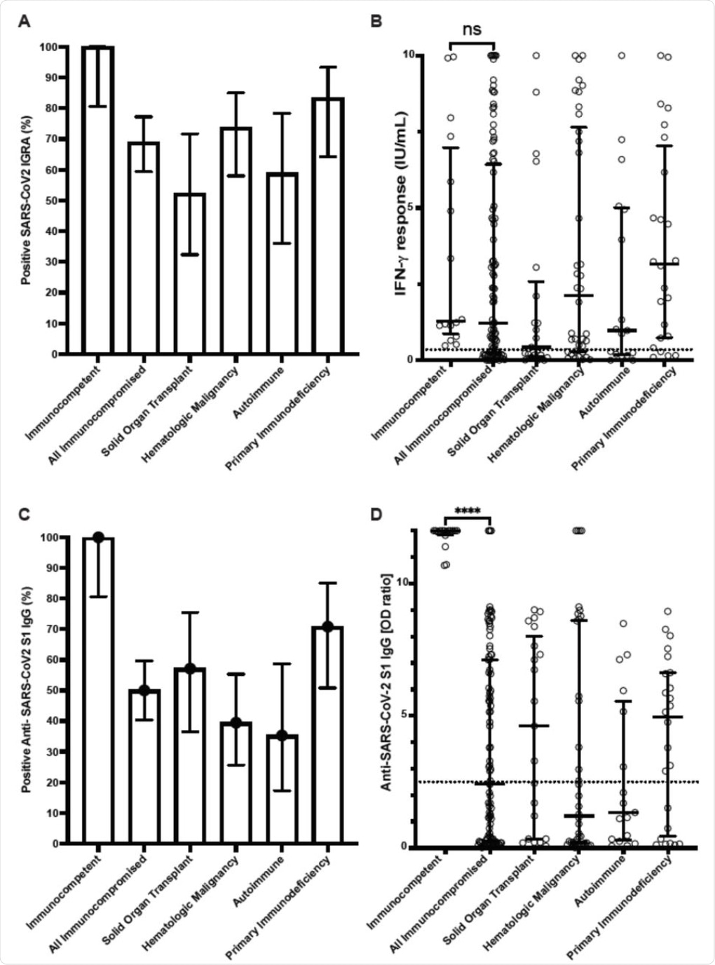 Cellular and humoral immune responses to SARS-CoV-2 mRNA vaccine in immunocompetent individuals and immunocompromised patients determined with clinical assays. (A) Percentage of patients with positive SARS-CoV2 interferon-γ release assay (IGRA) result. (B) Interferon-γ response from IGRA in immunocompetent individuals (n=16) and immunocompromised patients (n=100) (C) Percentage of patients with positive Anti-SARS-CoV2 S1 IgG ELISA result. (D) Anti-SARS-CoV2 S1 IgG optical density (OD) ratio from ELISA performed in immunocompetent and immunocompromised patients. Results for immunocompromised subgroups are also shown. Dotted lines represent the assay cutoffs (0.35 IU/mL for IGRA and 2.5 optical density ratio for IgG). Long solid lines show median, short solid lines show 95% confidence interval. ns, not significant and ****, p<0.0001 by Mann-Whitney U test.