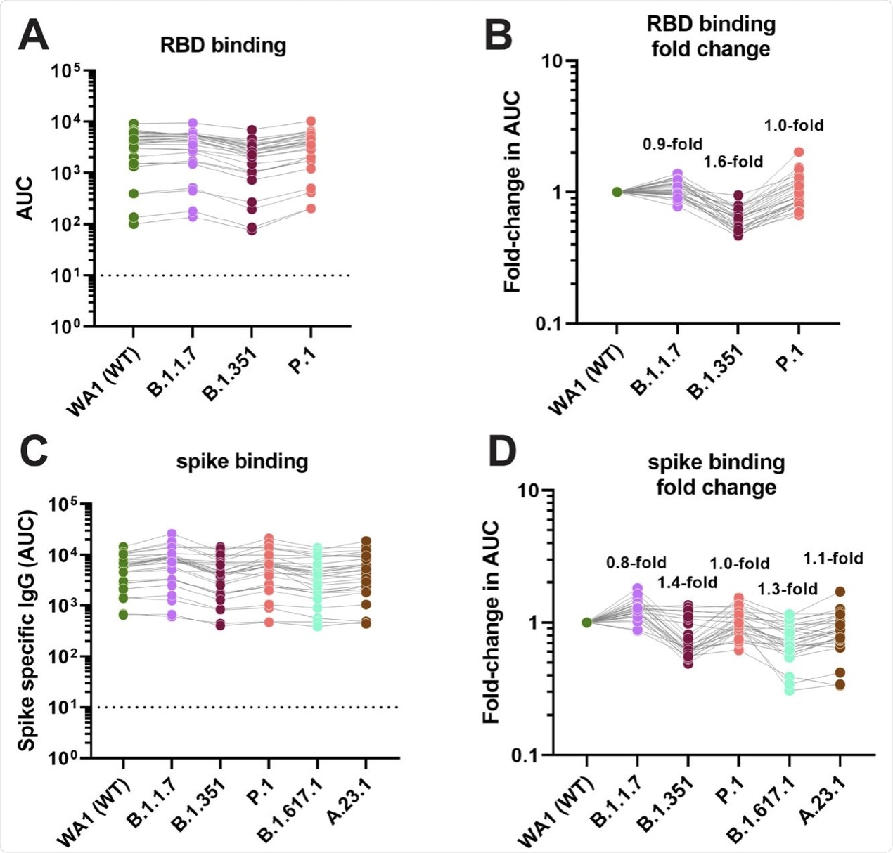 When tested against the full-length spike protein, no significant change was observed against the spike proteins of the B.1.1.7, B.1.351. P.1, B.1.617.1, and A.23.1 variants. The greatest reduction of 1.4-fold was reported for the Beta variant.