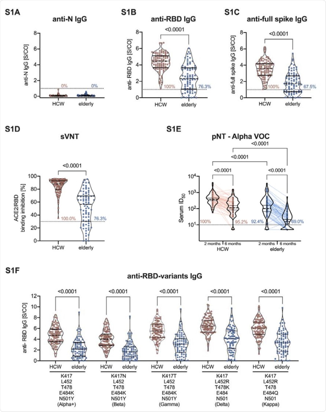 The current study revealed that the anti-SARS-CoV-2 S1-immunoglobulin G (IgG) seropositivity rates decreased in the elderly group as compared to the HCW group six months post-vaccination. The researchers also found that the lowering of anti-RBD- and anti-full S-IgG levels in the serums of the elderly group was more pronounced than HCWs. The current study also reports a significant decrease in surrogate virus neutralization (sVNT) titers among the elderly at 56% as compared to 88.1.