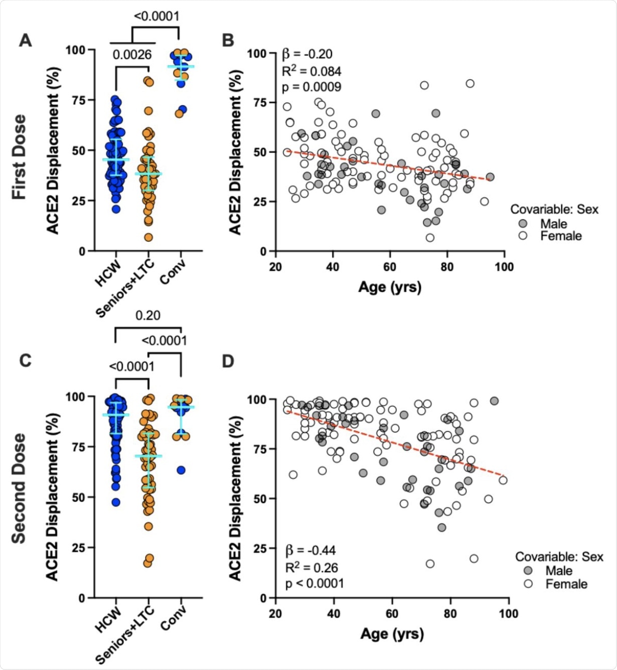 Panel A: Ability of vaccine-induced plasma antibodies to displace soluble ACE2-receptor from spike RBD, measured using a Luminex ELISA assay, following one dose of vaccine in COVID-19 naive Seniors+LTC (orange circles), HCW (blue circles), and COVID-19 convalescent participants (“Conv”; colored as above). Bars represent median and IQR. P-values computed using the Mann-Whitney U-test. Panel B: Same data as the HCW and Seniors+LTC groups shown in panel A, but plotted by age, and colored by sex, which remained significant in multivariable analyses (see Table 2). Statistics computed using ordinary least-squares regression, also shown as dotted line. Panels C, D: Same as A and B, but for responses following two doses of mRNA vaccine.