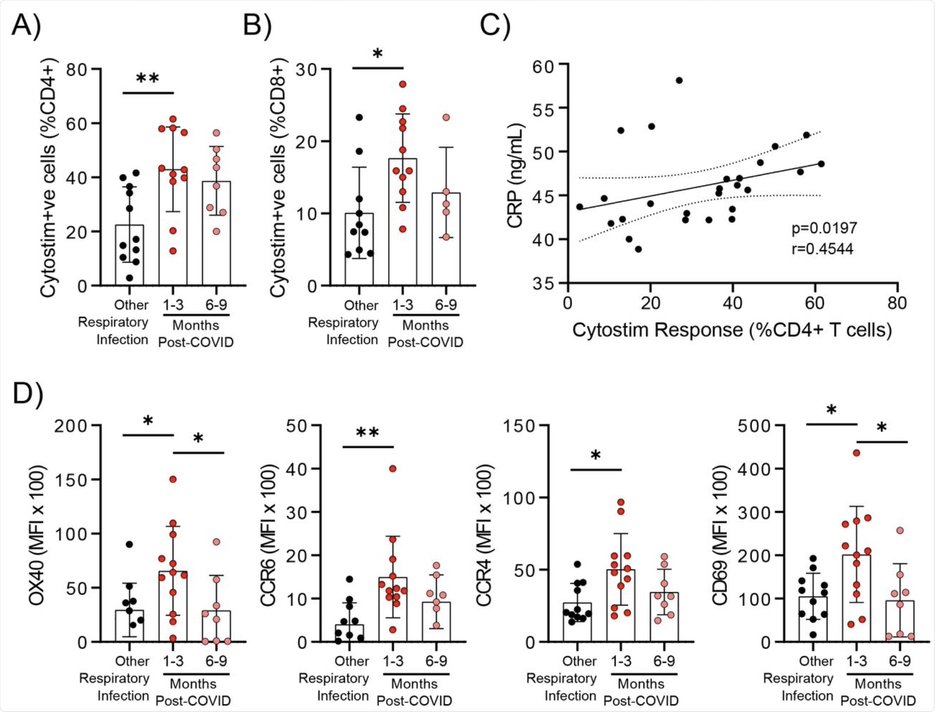 Evidence of prolonged T cell activation after mild SARS-CoV-2 infection. The polyclonal activator Cytostim was used to measure T cell responses. COVID-19 seropositive individuals had a higher proportion of CD4+ (A) and CD8+ (B) activated T cells 1 to 3 months after infection compared to seronegative individuals after other respiratory infections. C) The number of CD4+ T cells that responded to polyclonal stimulation correlated with CRP in COVID-19 seropositive individuals. D) Activation markers on the Cytostim-responsive CD4+ T cells OX40, CCR6, CCR4, and CD69 were higher 1-3 months after COVID-19 infection compared to after other respiratory infections. Each participant is indicated by a single data point: other respiratory infection n=7-11; 1-3 months post COVID-19 infection n=11-12; 6-9 months post COVID-19 infection n=5-8. Multiple group comparisons in A-B and D were tested using Welch’s One-Way ANOVA and Games-Howell post-hoc test; bars are presented as mean ± standard deviation. Data in C was assessed by Spearman’s rank correlation. *P<0.05; **P<0.01.