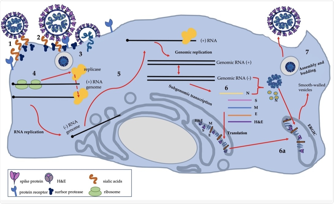 The N protein aids in the viral replication process and limits translation in host cells. The M, E, and N proteins work together to bring about the folding and budding of a newly assembled virion. The role of the HE protein is virion attachment, wherein it functions as a supporting binding molecule in addition to the S protein.