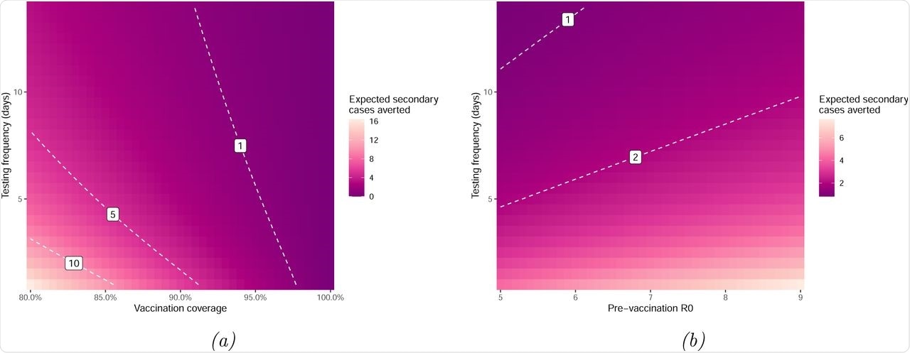A larger pre-vaccination R0 and testing frequency results in an increase in the expected number of secondary cases averted. Previous research concluded that a 95% vaccination rate among students is what is required to safely return to campuses. Also, over 64% of vaccine coverage would lead to less than 5% of the university population becoming infected.