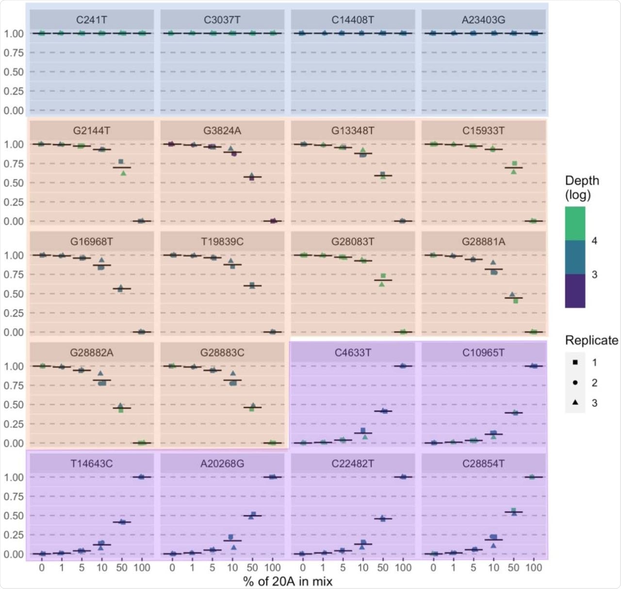 Measured allele frequency (y-axis) for all expected mutations (n =20) in sample mixtures described in Table 2. Blue panels = mutations common to 20A and 20B samples, orange panels = mutations expected in 20B sample, purple panel = mutations expected in 20A sample.