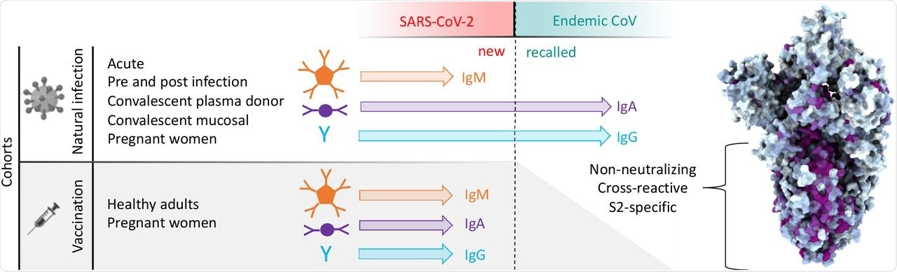 The team also found OC43-specific immunoglobulin G (IgG) in both the serum and mucosal samples, as well as mucosal IgA, but not IgM, in acutely infected subjects two weeks post-COVID-19 diagnosis. This finding indicates that these elevated responses were real and not due to newly induced antibody lineages with cross-reactivity to OC43. Testing of serum samples pre- and post- SARS-CoV-2 infection reinforced the hypothesis that pre-existing clonal families were boosted by the SARS-CoV-2 infection.