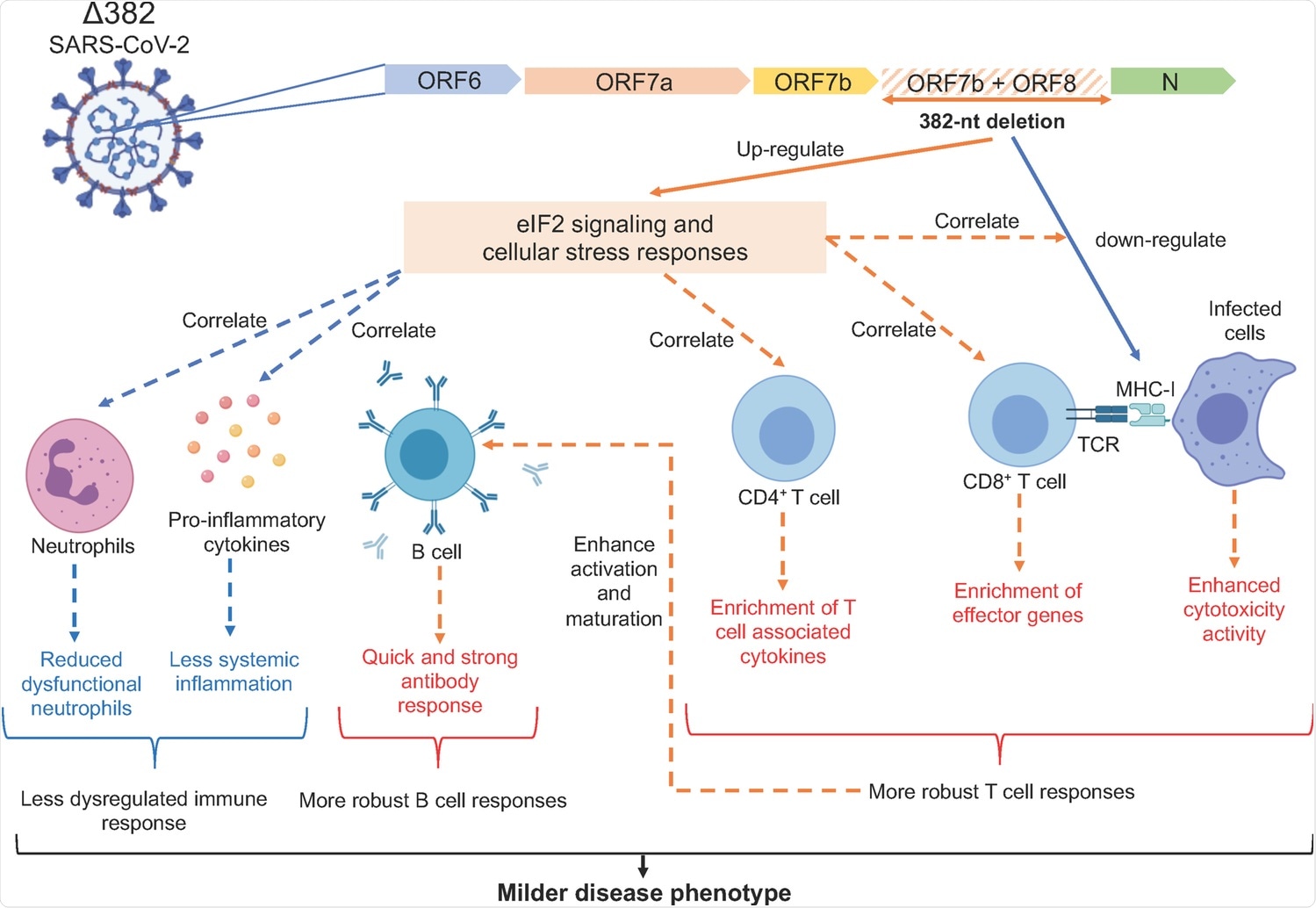 The researchers also reported an under-expression of neutrophil activation-associated signature in Δ382 SARS-CoV-2 infected patients. Additionally, strong evidence of effector cytotoxic genes, as well as upregulation of SARS-CoV-2 specific T-cell immunity and antibody responses were observed, all of which strongly indicated robust T- and B-cell responses.