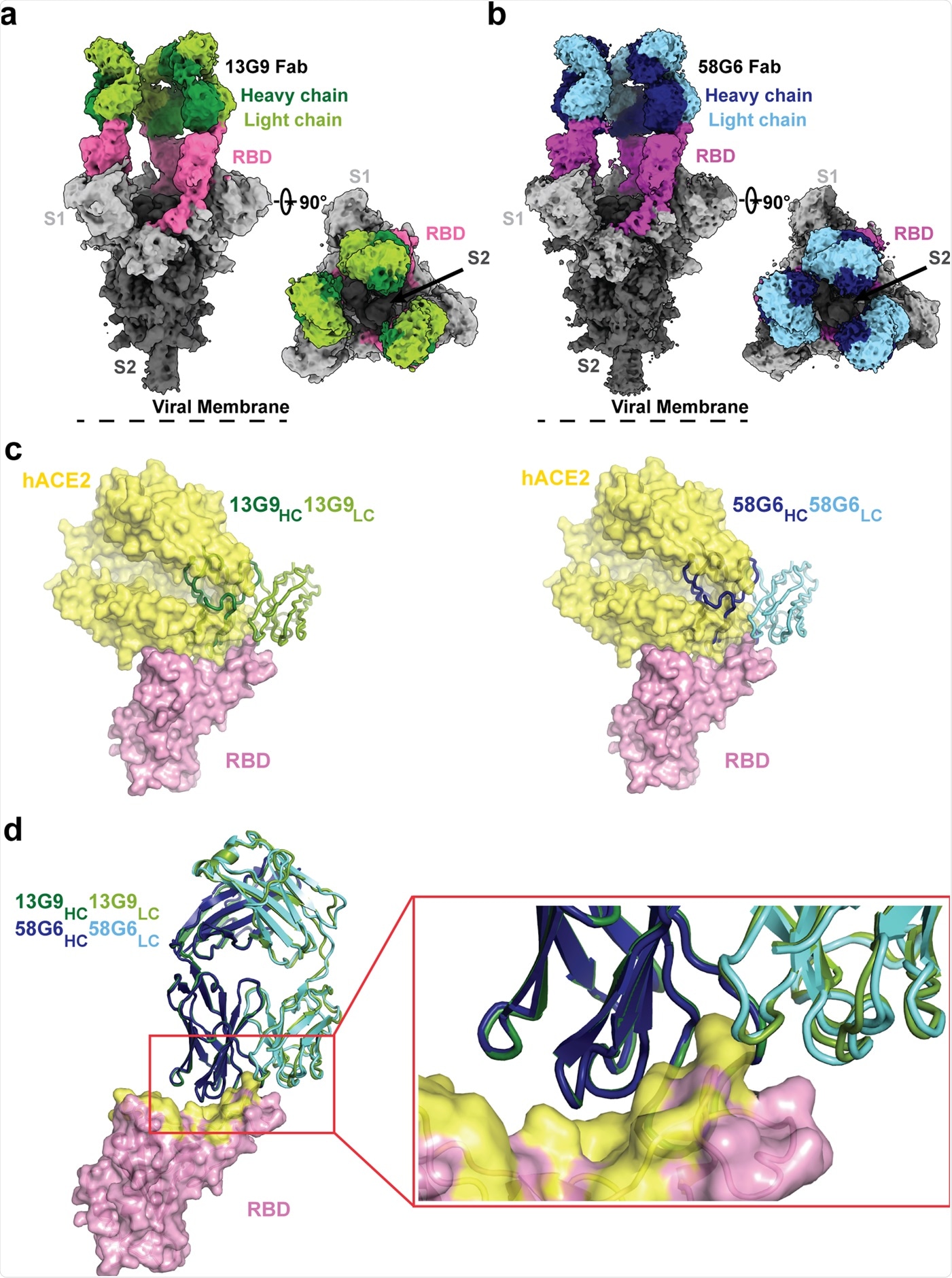Cryo-EM densities for 13G9 Fab (antigen binding fragment)-S (a; 3.9 Å) and 58G6 Fab-S (b; 3.6 Å) complexes, revealing binding of 13G9 or 58G6 to RBDs in the all ‘up’ state. c Superimposition of RBD-hACE2 [Protein Data Bank (PDB) ID 6LZG][https://www.rcsb.org/structure/6LZG] complex structure together with RBD-13G9 Fab (left) or RBD-58G6 Fab (right) variable domains, respectively. d Alignment of 13G9 and 58G6 Fabs on the same RBD. HC, heavy chain; LC, light chain. CDR, complementarity determining region.