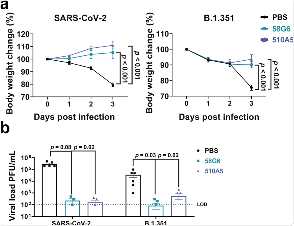 For this experiment, the mice were administered the antibodies 58G6 and 510A5 or phosphate-buffered saline (PBS) as intraperitoneal injections and subsequently exposed intranasally to the wild-type strain fo SARS-CoV-2 or the B.1.351 variant. It was found that both 58G6 and 510A5 treated groups of animals exposed to the wild-type SARS-CoV-2 strain were able to maintain their body weight for three days post-infection.