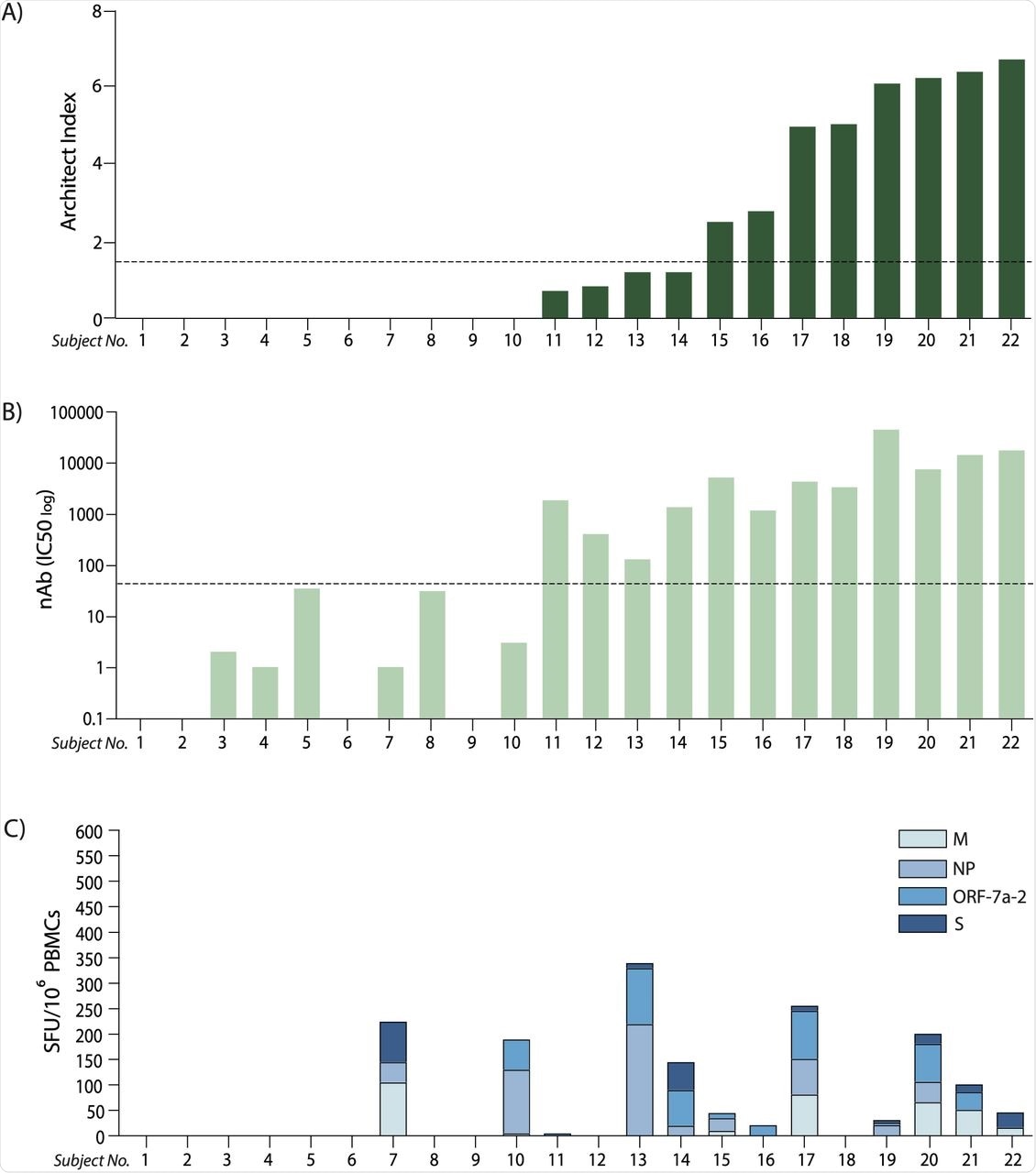 (A) Anti-nucleoprotein IgG levels expressed as Architect Index (manufacturer arbitrary units) for each subject analysed (ordered lowest to highest level); the dotted line represents the 1.4 cut-off, below which samples are considered as negatives. (B) Neutralising antibody (nAb) titres (IC50) corresponding to the same subjects in (A); the dotted line represents the cut-off below which samples are considered as negatives (IC50<50). (C)Cumulative T cell response to the four peptide pools derived from SARS-CoV-2 expressed as spot-forming units (SFU) of IFN-γ-secreting cells after 16-hour stimulation, ordered corresponding to the subjects in (A) and (B). (M: membrane; NP: nucleoprotein; ORF-7a-2: open reading frame 7a-2; S: spike).