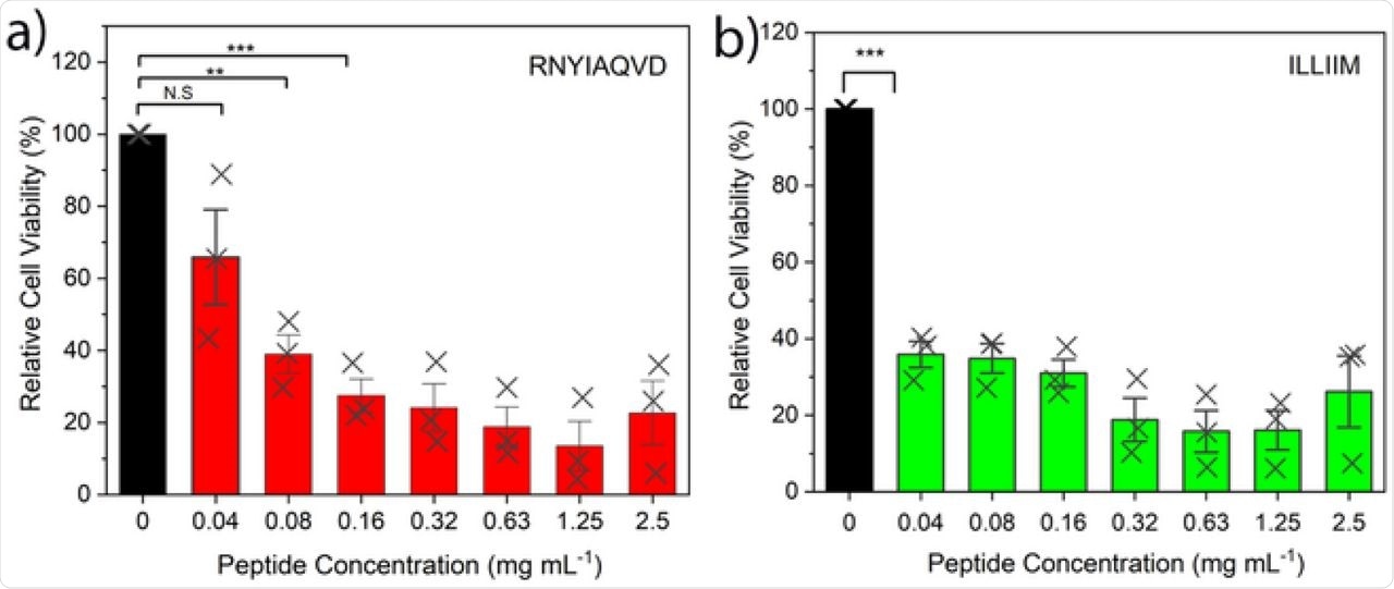 Cytotoxicity assays of RNYIAQVD and ILLIIM assemblies over a range of concentrations. Error bars represent 1 Standard Deviation. Statistical analysis performed by one way ANOVA with Tukey comparison. N.S. = No statistical significance, ** = p < 0.0005, *** = p < 0.0001.