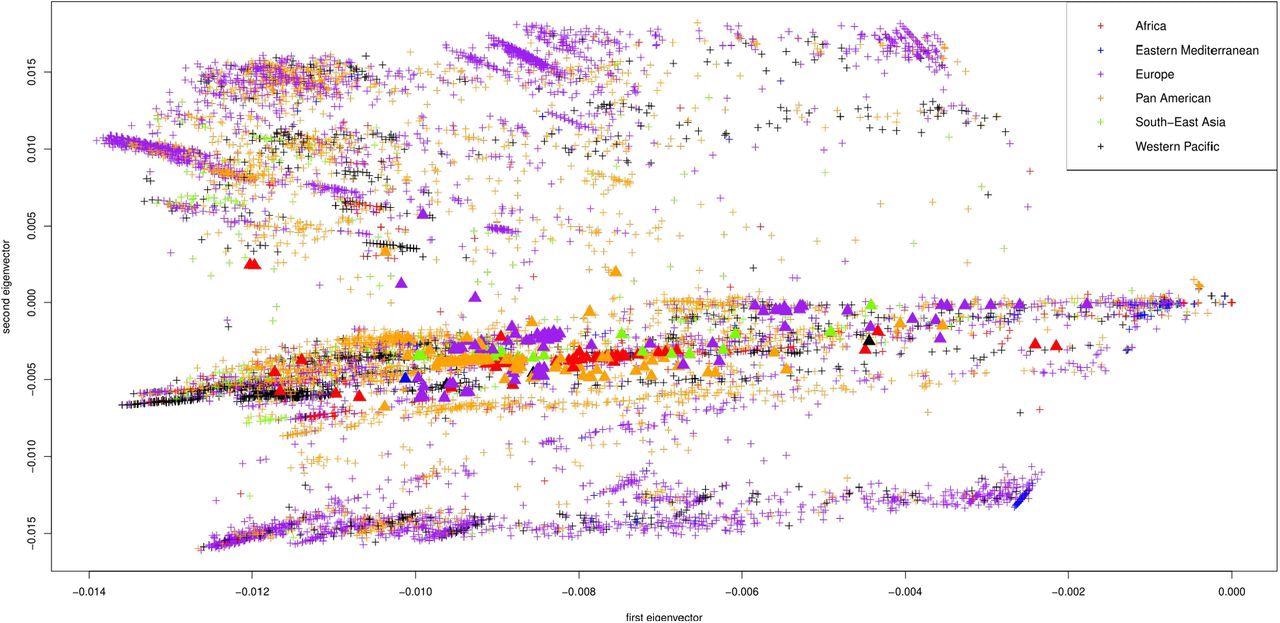 In the current study, the researchers utilized an unsupervised genome-wide cluster analysis based on the Jaccard similarity matrix. Herein, a given set of nucleotide sequences were assigned to a reference sequence, which was followed by a principal component analysis (PCA).