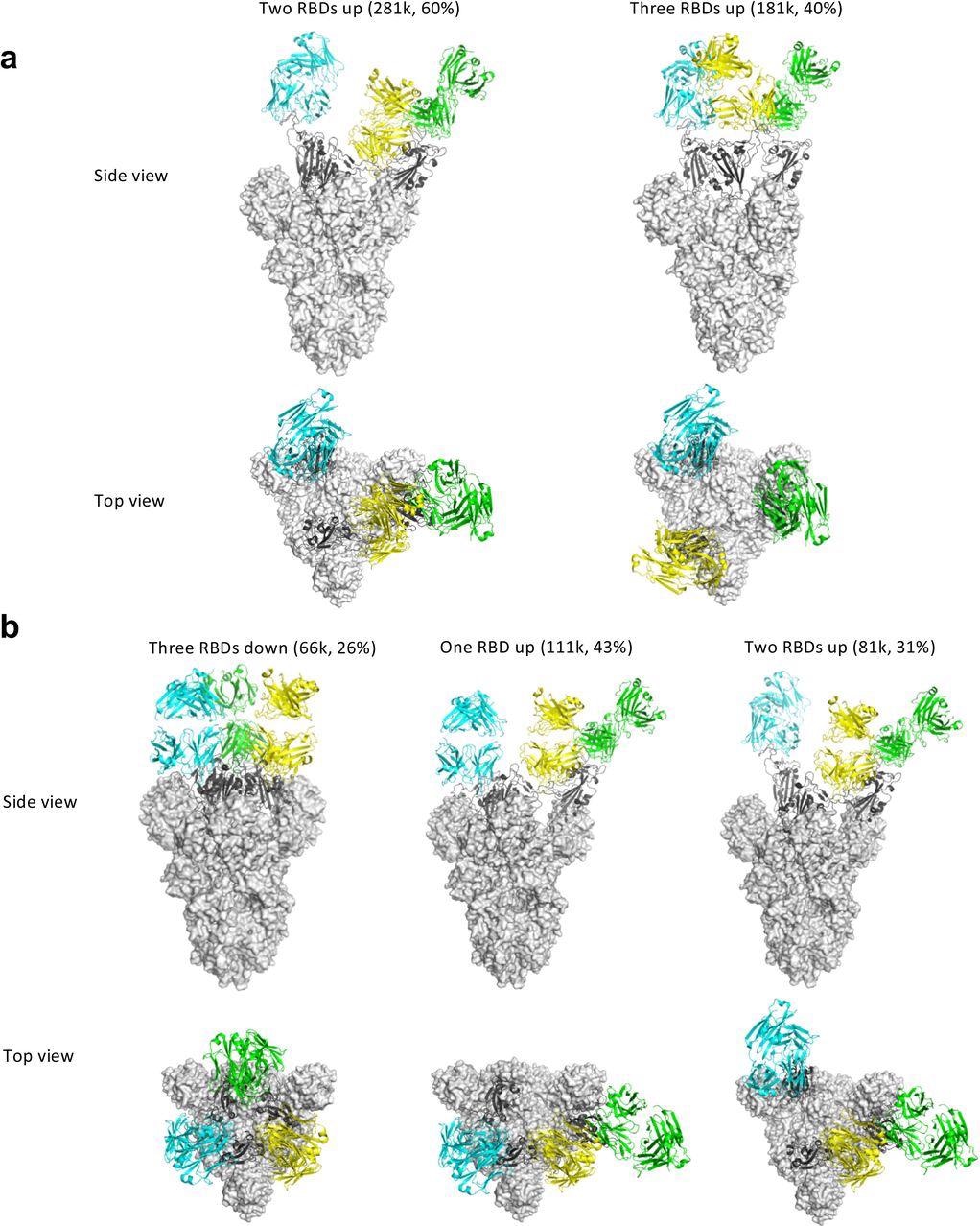 A down-RBD-binding Clone 6 Fab can also connect with a nearby up-RBD through a quaternary epitope found on the sidewall of the up-RBD, which interferes with ACE2 binding, effectively preventing access of the angiotensin-converting enzyme 2 (ACE2) receptor to two RBDs at the same time. When complexed with Clone 6 Fab, this bipartite binding mode is likely more stable than the single binding mode with the up-RBD alone, which explains why no spike trimer with all three RBDs open was found.