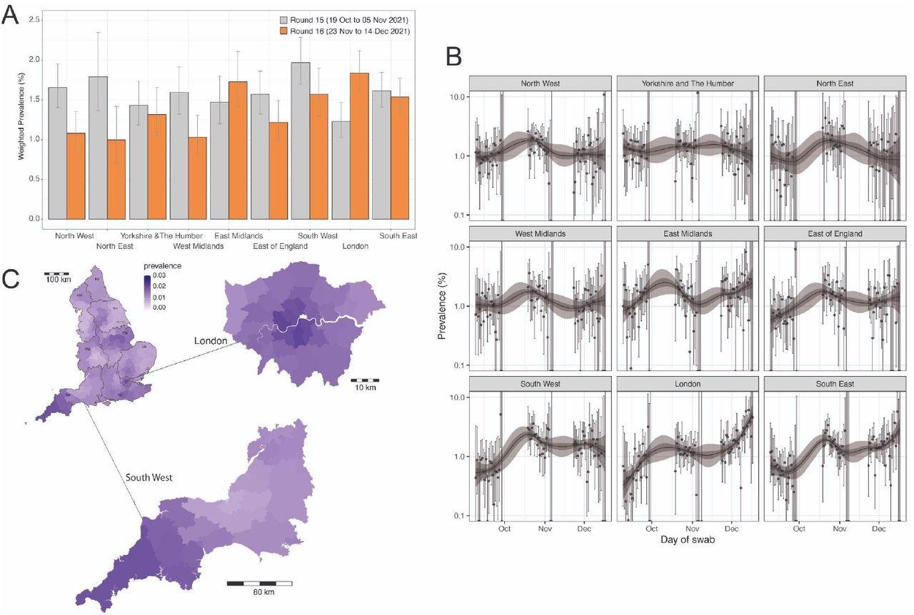 (A) Weighted prevalence of swab positivity by region for round 15 and round 16. Bars represent prevalence point estimates (grey for round 15 and orange for round 16), and the vertical lines the corresponding 95% confidence intervals. (B) P-spline models fit to all rounds of REACT-1 for each of the nine regions separately. Shown here only for the period of round 14, round 15 and round 16. Shaded regions show 50% (dark shade) and 95% (light shade) posterior credible interval for the P-spline models. (C) Neighborhood smoothed average prevalence by lower-tier local authority area for round 16. Neighborhood prevalence was calculated from nearest neighbors (the median number of neighbors within 30 km in the study). Average neighborhood prevalence displayed for individual lower-tier local authorities for the whole of England and for South East, South West and London. Regions: NE = North East, NW = North West, YH = Yorkshire and The Humber, EM = East Midlands, WM = West Midlands, EE = East of England, L = London, SE = South East, SW = South West