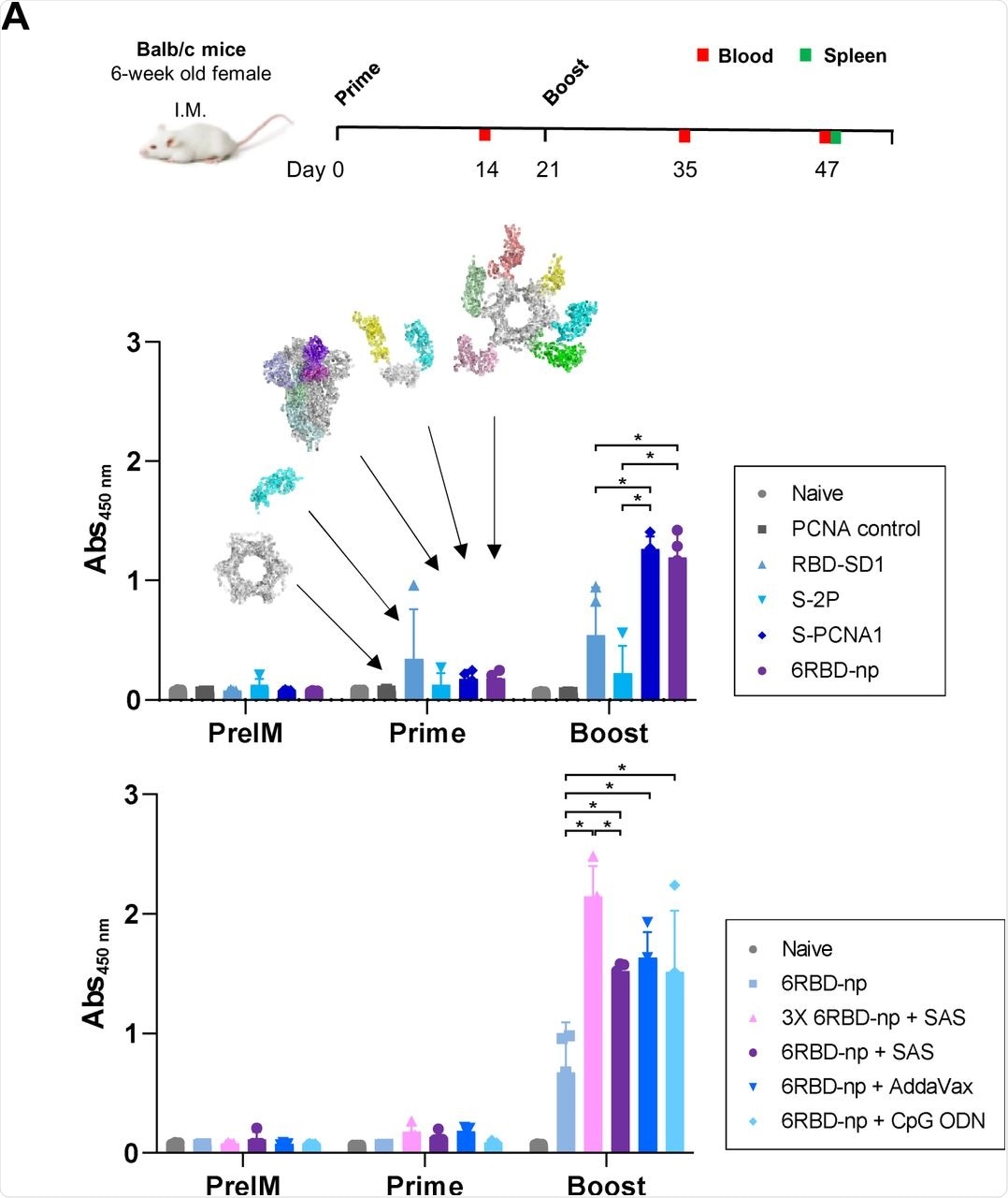 Mice that received S-PCNA1 alone, as well as those that received 6RBD-np exhibited the highest antibody titers after their booster dose, thereby demonstrating that a robust antibody response was achieved by these two treatments.