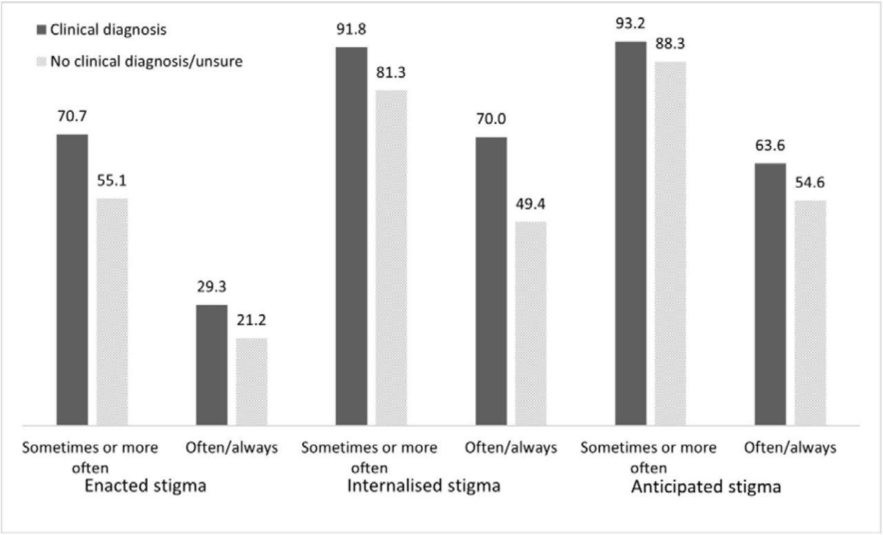 The second estimated prevalence of respondents included individuals who answered ‘often’ or ‘always’ to one or more questions. These responses were also stratified according to whether participants reported having a clinical diagnosis or not.