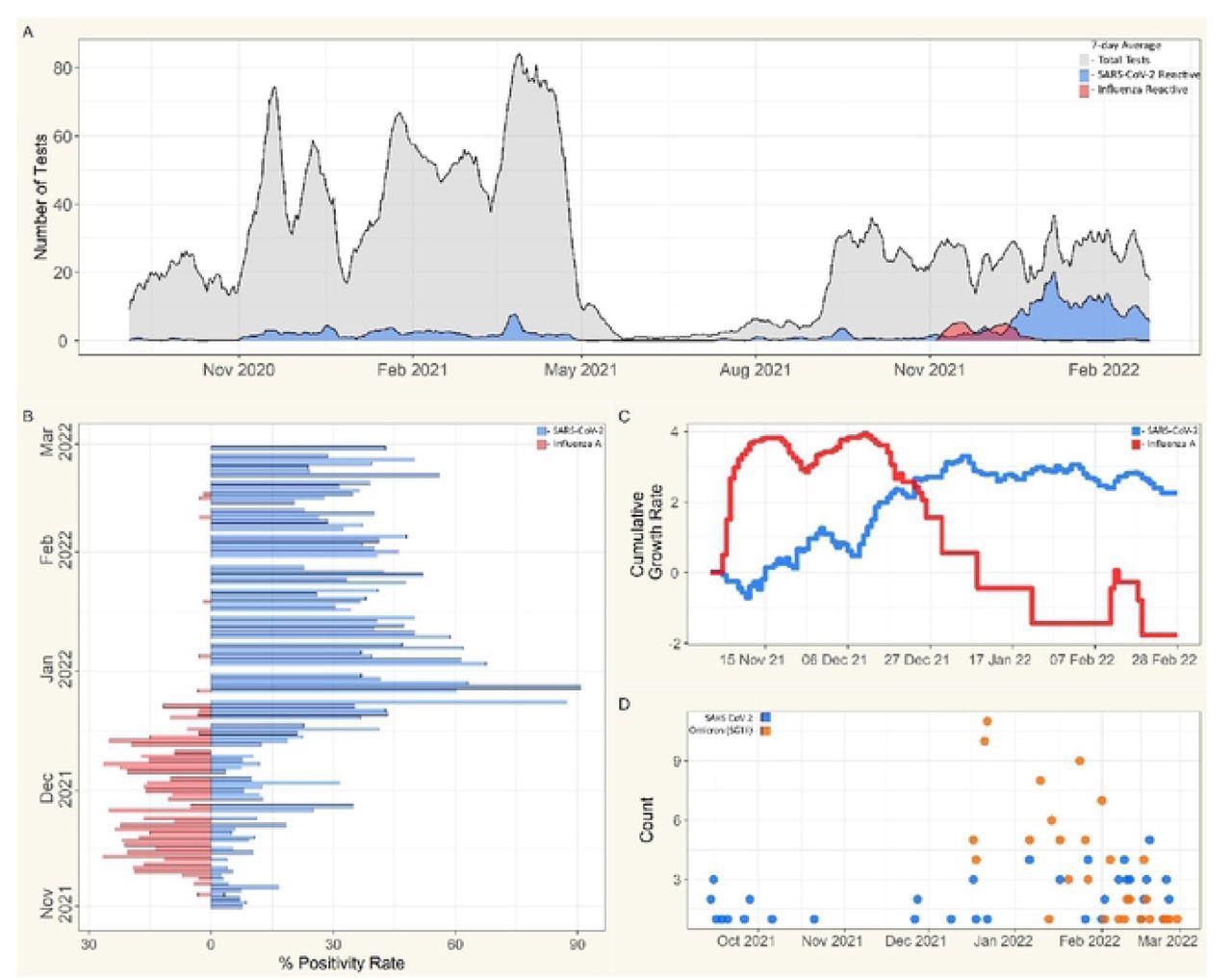A) Seven-day averages for RT-qPCR testing collected from symptomatic individuals; tests collected, grey, reactive for SARS-CoV-2, blue, reactive for Flu A, red. B) Positivity rate for symptomatic cohort from November 1st, 2021,. to February 28th, 2022; SARS-CoV-2, blue; Flu A. red. C) Cumulative growth rates for seven-day averages of SARS-CoV-2 and influenza incidence in symptomatic cohort from November 1st. 2021. to February 28th, 2022; SARS-CoV-2. blue; Flu A. red. D) Totals of SARS-CoV-2 Omicron (B.1.1.529) variant determination via S-gcnc target failure (SGTF) for symptomatic population from September 14th, 2021, to February 28th 2022; SARS-CoV-2, blue; SGTF, orange, n=172.