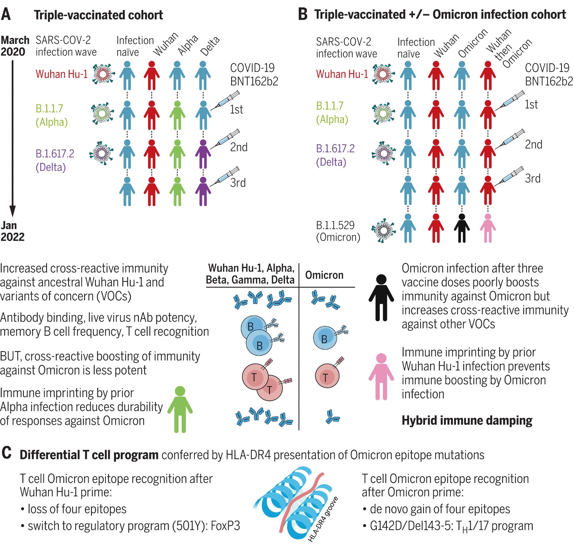Hybrid immune damping. (A) Triple-vaccinated HCWs with different SARS-CoV-2 infection histories show boosted cross-reactive immunity against VOCs, less so against Omicron. (B) Breakthrough infection during the Omicron wave boosts cross-reactive immunity in triple-vaccinated, previously infection-naïve individuals against VOCs, less so against Omicron itself; imprinting by previous Wuhan Hu-1 infection ablates Omicron immune boosting. (C) T cell recognition of Omicron mutation sequences is linked to altered transcription.Hybrid immune damping. (A) Triple-vaccinated HCWs with different SARS-CoV-2 infection histories show boosted cross-reactive immunity against VOCs, less so against Omicron. (B) Breakthrough infection during the Omicron wave boosts cross-reactive immunity in triple-vaccinated, previously infection-naïve individuals against VOCs, less so against Omicron itself; imprinting by previous Wuhan Hu-1 infection ablates Omicron immune boosting. (C) T cell recognition of Omicron mutation sequences is linked to altered transcription.