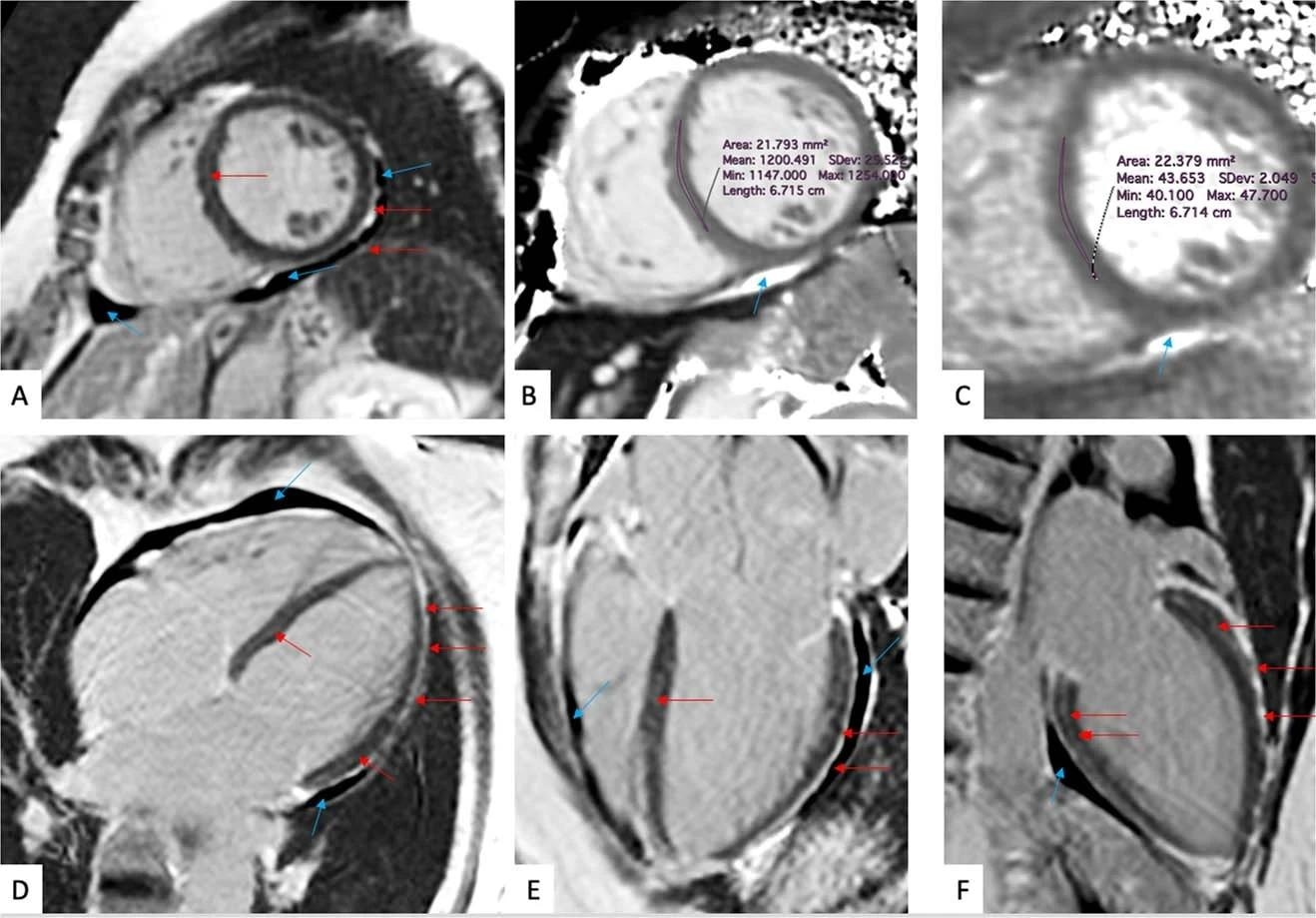 (a-f) Late gadolinium enhancement imaging (A, D-F) and Native T1 (B) and T2 (C) mapping measurements of a 57-year-old woman evaluated 201 days after COVID-19 infection. This individual reported dyspnea, palpitations, and chest pain, worsening on minimal exertion. Late gadolinium enhancement imaging allows to visualize regional accumulation of the gadolinium-based contrast agent along the outer rim of the myocardial free wall (red arrows), as well as within the thickened pericardial layers, separated by small amounts of pericardial effusion (blue arrows).