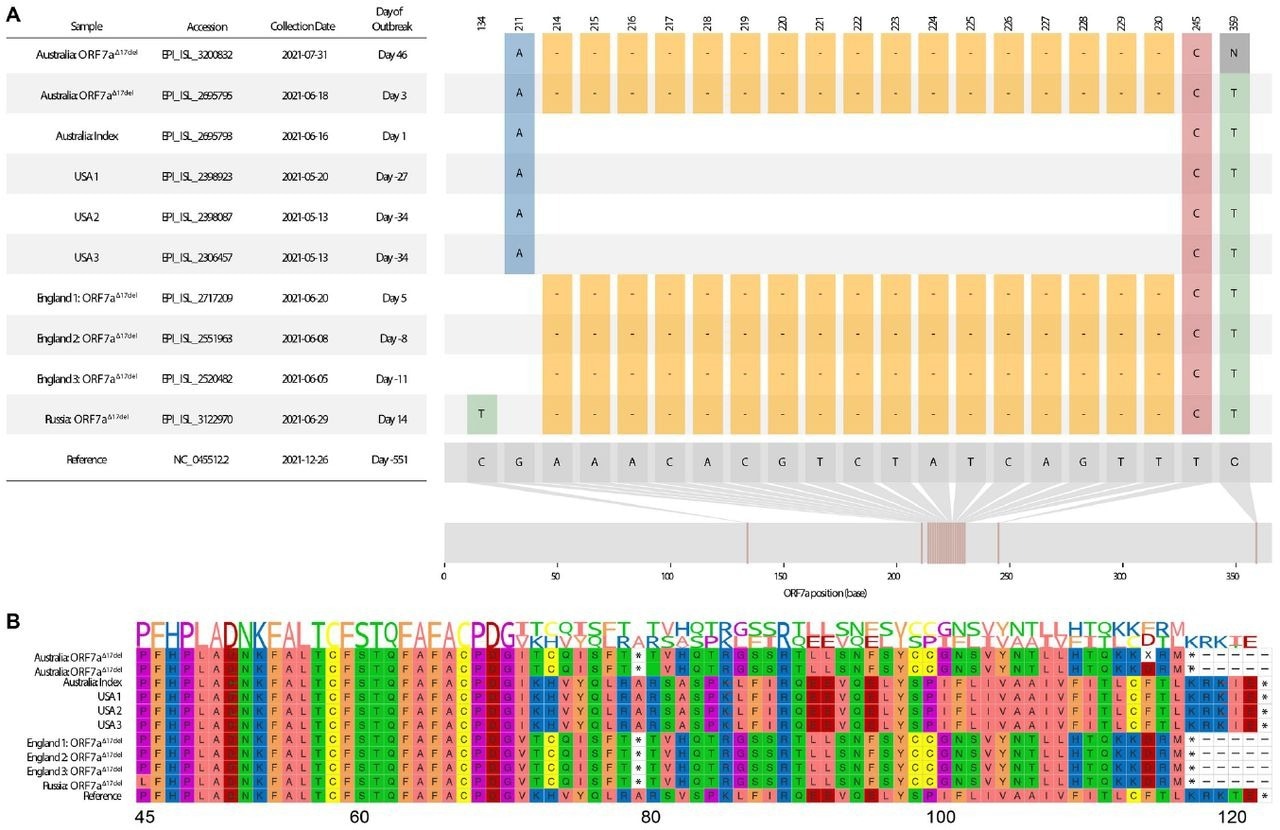 SARS-CoV-2 ORF7a protein deletions (del) have been reported since the initial coronavirus disease 2019 (COVID-19) pandemic period. Delta outbreaks occurred in Australia from June 2021 to February 2022, and whole-genome sequencing (WGS) of the causative Delta variant showed ORF7a truncation due to the presence of a 17-nucleotide (nt) frameshift-inducing deletion.